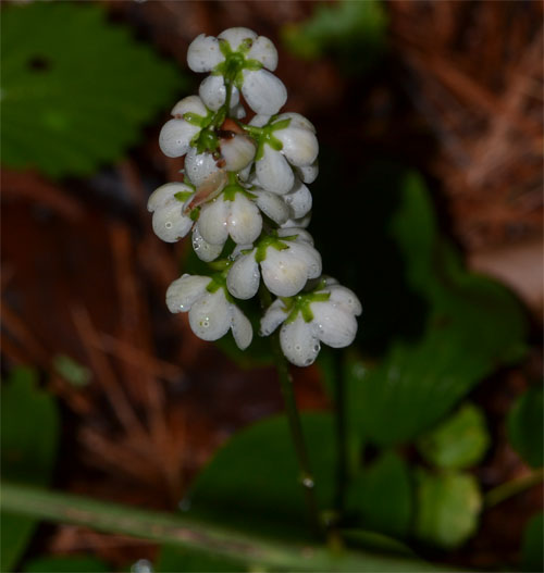 I found this particular wintergreen in the darkest possible place in the Bridge Street conservation area in Barnstable. It has the thick arrangement of flowers often seen in Pyrola minor (snowline wintergreen), but Cape Cod is too far south for its range. Is this Pyrola americana (american wintergreen), or another Pyrola species? This particular plant had no basal leaves. Can anyone help me identify this species?